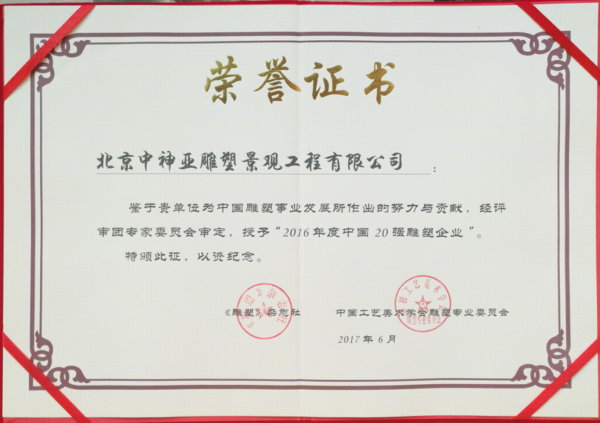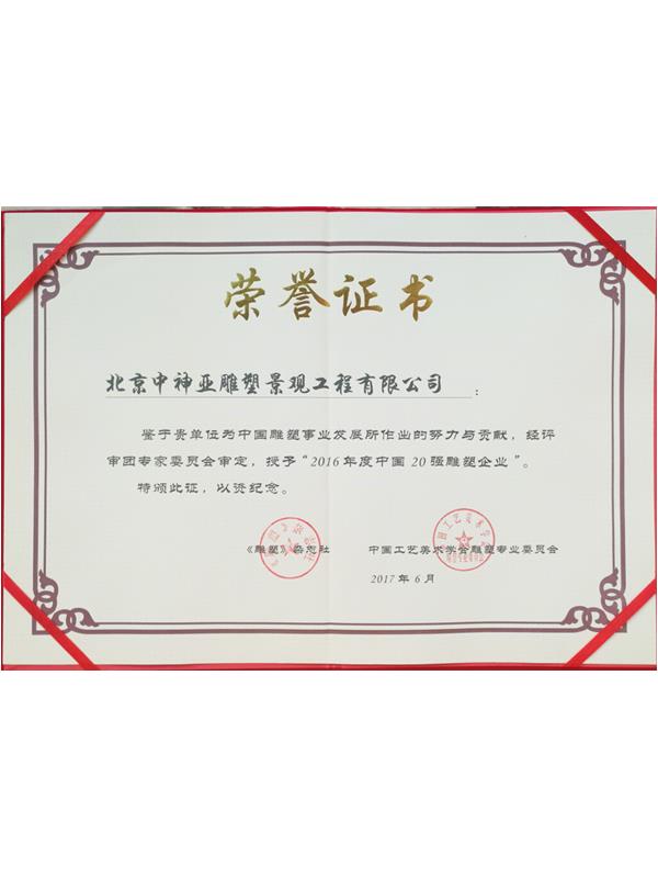 2016年度中國20強雕塑企業榮譽證書