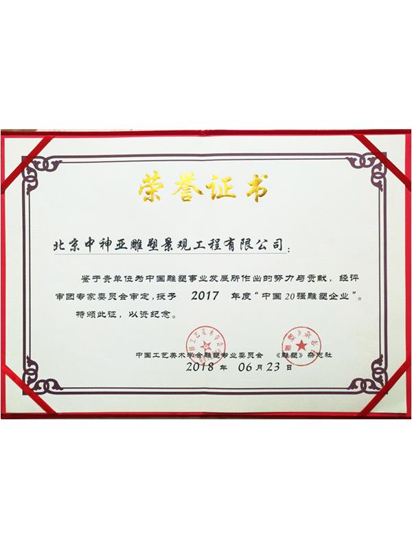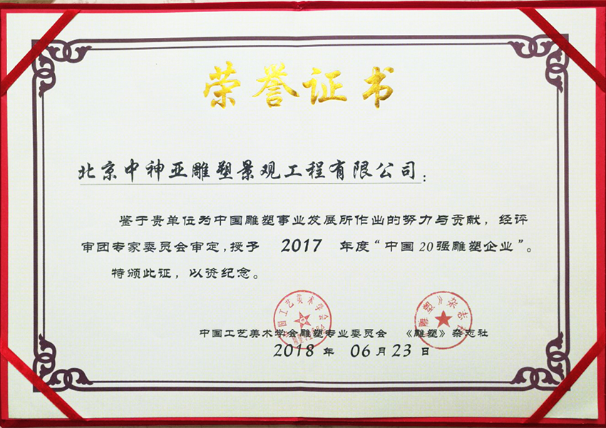 2017年度中國20強雕塑企業榮譽證書