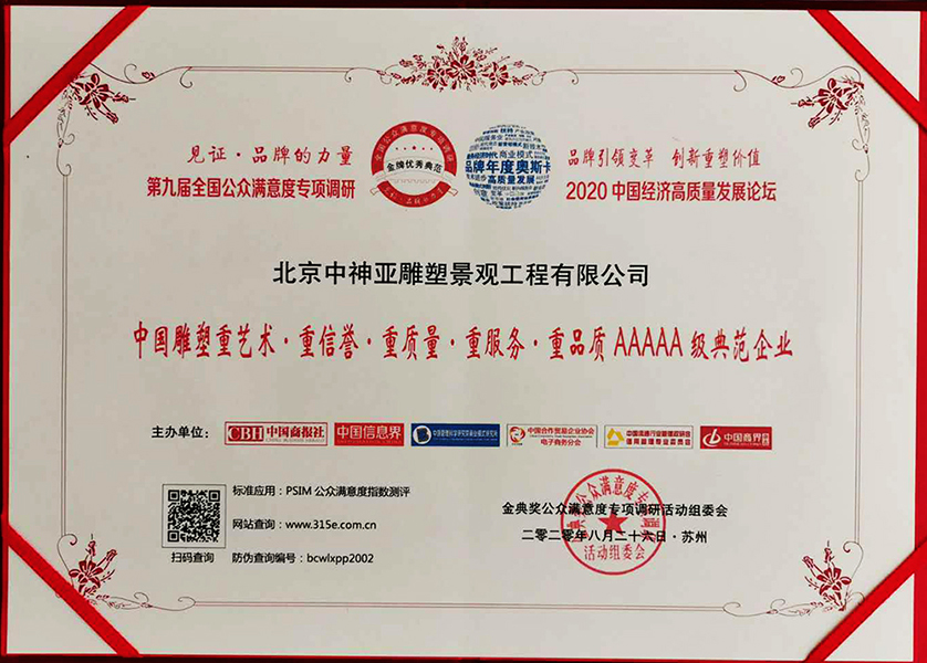 2015年度中國20強雕塑企業榮譽證書