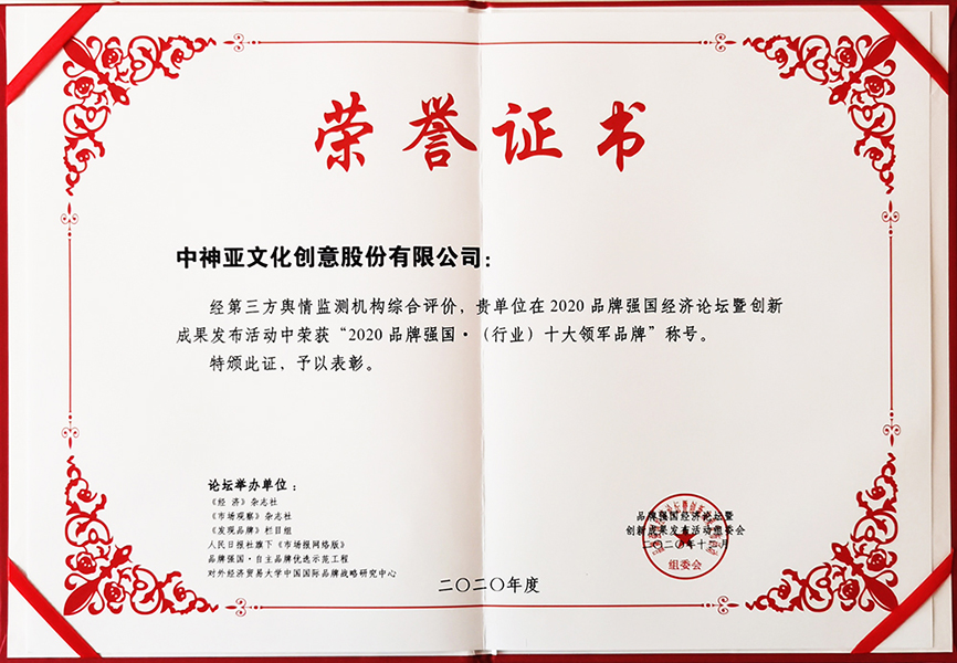 2013年度中國20強雕塑企業榮譽證書