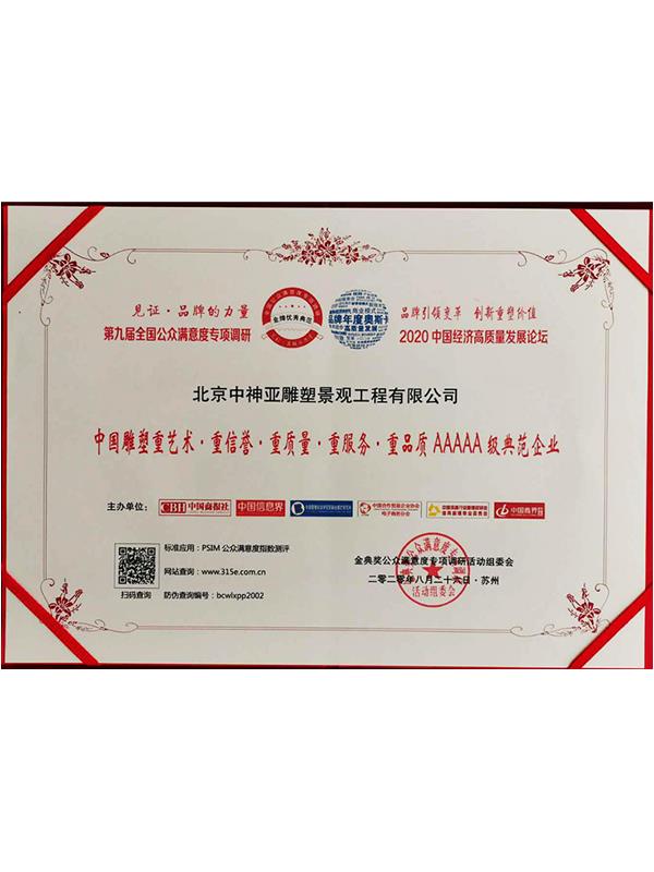 2014年度中國20強雕塑企業榮譽證書
